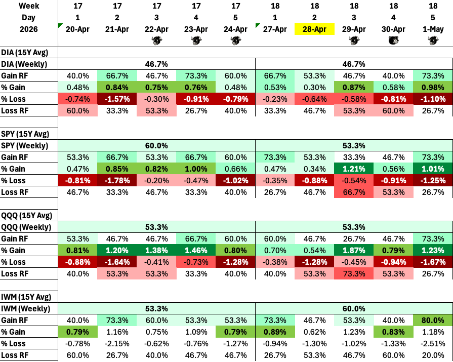 According to the PTSD*, Week 17 has FIVE trading days and is the LAST trading week in April 2026. The next Expiration Friday is MAY15. The next Market Holiday is on MONDAY MAY25. Seasonally, Weeks 16 and 17 have historically been the most bullish weeks of the year. April is the last of the “6 months of bullishness” on the SPX.