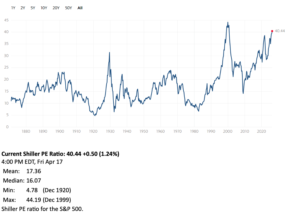 The Shiller PE Ratio, as of Fri 17 Apr, is at 40.44, 2.77% higher than the previous week of 39.35.